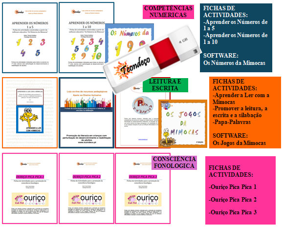 A pen-drive com todas as Fichas de Actividades e os softwares Os Jogos da Mimocas e os Números da Mimocas. Disponibilidade e promoção por tempo determinado.